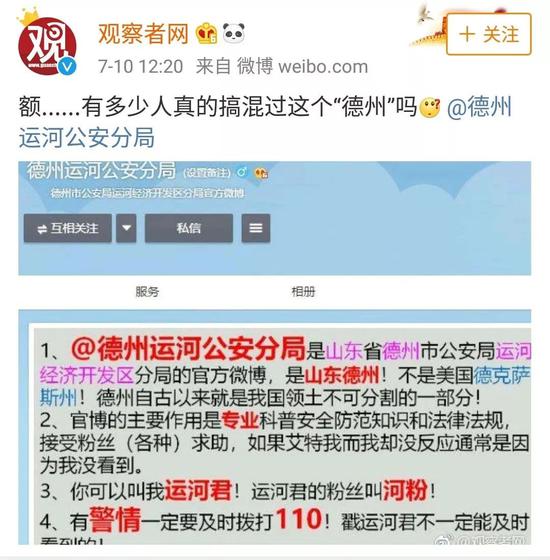 觀察者網(wǎng)在微博上艾特德州運(yùn)河公安分局官方微博: