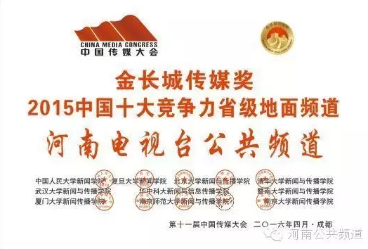 河南公共頻道報(bào)榮獲“金長(zhǎng)城傳媒獎(jiǎng)·2015年中國(guó)十大競(jìng)爭(zhēng)力省級(jí)地面頻道”榮譽(yù)。