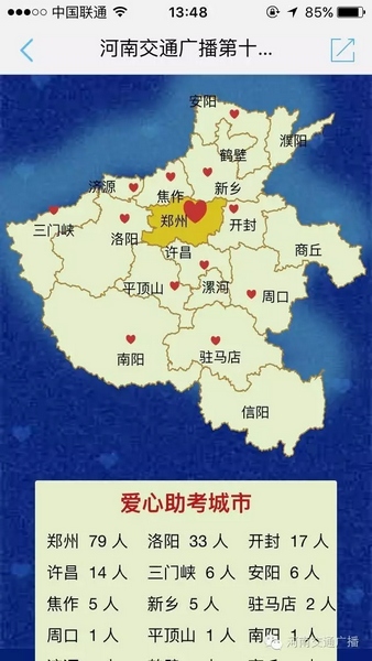 高考期間,河南交通廣播倡導(dǎo)全省車友綠色出行、在交廣領(lǐng)航上用愛心點(diǎn)亮河南地圖;