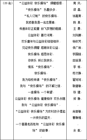據(jù)統(tǒng)計(jì),活動(dòng)期間共收到省內(nèi)外征文272篇,其中不乏很多優(yōu)秀作品。在評(píng)選工作中,很多作品都寫出了真情實(shí)感,感人至深的故事。征文作者中有受捐助小學(xué)的老師和學(xué)生,有受助小學(xué)學(xué)生的家長(zhǎng), 有為家鄉(xiāng)申請(qǐng) “快樂(lè)操場(chǎng)” 的體彩銷售員和體彩工作人員,還有見(jiàn)證了 “快樂(lè)操場(chǎng)” 活動(dòng)的媒體記者,更有大學(xué)生志愿者。另外,還收到很多郵寄到報(bào)社的手寫稿件。感謝全國(guó)各地的讀者朋友對(duì)公益事業(yè)和本次活動(dòng)的支持, 我們會(huì)從中擇優(yōu)選取部分稿件在大河報(bào)彩票版、 大河客戶端彩票頻道上刊發(fā), 以此作為答謝。