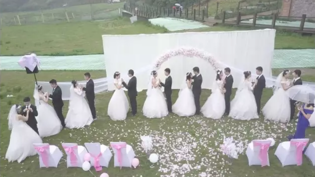 青山環(huán)抱的草坪中間,鮮花點(diǎn)綴,西服、婚紗、司儀……一樣不少,成對(duì)的新郎新娘溫情相擁,環(huán)繞的云霧和綿綿細(xì)雨,更為這場(chǎng)婚禮營(yíng)造了浪漫的氣氛。據(jù)網(wǎng)上文章稱,婚禮現(xiàn)場(chǎng)的新郎、新娘們,是來自成都一高校工程造價(jià)管理專業(yè)大四一畢業(yè)班的15對(duì)情侶。