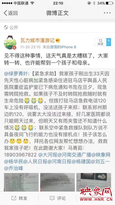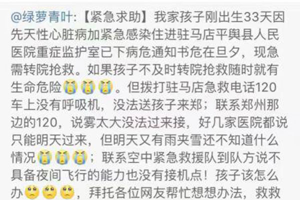 11月20日晚,一條微博牽動著無數(shù)人的心。駐馬店平輿縣一個剛剛出生33天的嬰兒因先天性心臟病加緊急感染被駐馬店市平輿縣人民醫(yī)院下達了病危通知書,但當?shù)蒯t(yī)療條件有限,患兒無法得到及時有效的治療,急需轉(zhuǎn)院治療,但聯(lián)系的鄭州醫(yī)院因為天氣原因無法前往。