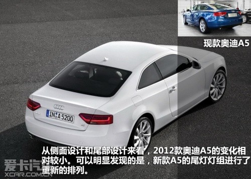 2012款?yuàn)W迪A5屬于中期改款車型,在外觀、內(nèi)飾、動(dòng)力和底盤(pán)上都有較為明顯的變化。依據(jù)之前的消息,新款車型將于今年9月在海外開(kāi)始接受預(yù)定。近日,2012款?yuàn)W迪A5在國(guó)內(nèi)的測(cè)試諜照也被首次曝光,預(yù)計(jì)新車不久就將引入國(guó)內(nèi)市場(chǎng)。(諜照來(lái)源:騰訊汽車)