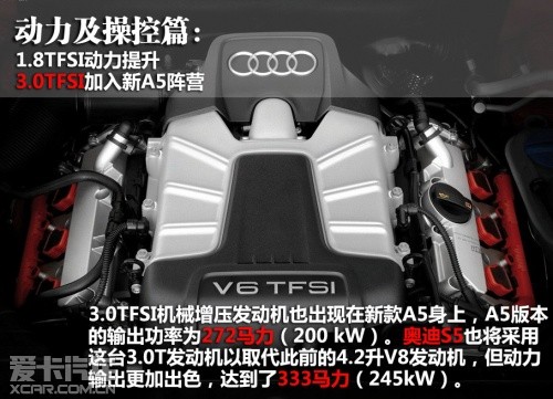 入門(mén)級(jí)的奧迪A5將采用1.8TFSI發(fā)動(dòng)機(jī),重新調(diào)教后,動(dòng)力輸出從158馬力提高到168馬力。2.0 TFSI發(fā)動(dòng)機(jī)的動(dòng)力輸出依舊為211馬力(155kW)。3.0TFSI機(jī)械增壓發(fā)動(dòng)機(jī)也出現(xiàn)在新款A(yù)5身上,A5版本的輸出功率為272馬力(200 kW)。奧迪S5也將采用這臺(tái)3.0T發(fā)動(dòng)機(jī)以取代此前的4.2升V8發(fā)動(dòng)機(jī),但動(dòng)力輸出更加出色,達(dá)到了333馬力(245kW)。變速箱方面,與以上幾款發(fā)動(dòng)機(jī)匹配的將有6速手動(dòng)、無(wú)級(jí)變速器、7速S tronic三種。
