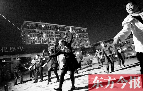 一塊百十平方米的小場地,距離居民樓不到10米。一盞探照燈,一個(gè)可滑動的大音響,伴隨著歌曲,三三兩兩的人就火熱開跳了。不遠(yuǎn)處,陸續(xù)還有人來。甩開外套,加入隊(duì)伍中。