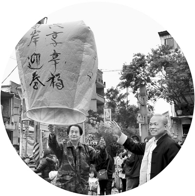 近日,臺(tái)灣毫芒雕刻家陳逢顯(右)與傳統(tǒng)天燈工藝大師林國(guó)和(左)一起放飛寫有“兩岸迎春· 共享幸?!钡奶鞜?。新北市平溪區(qū)放天燈久負(fù)盛名,已有百余年歷史。 王東明攝