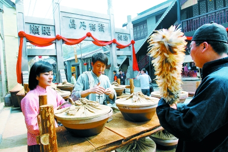 儀式在《大河兒女》專用外景拍攝基地“三河鎮(zhèn)”大戲樓前舉行。三河鎮(zhèn)的三條主街兩側(cè)的店鋪已經(jīng)全部開業(yè),紅綢高懸、人聲鼎沸,穿著長(zhǎng)衫馬褂的店小二熱情地招呼著來往的客人,戲樓上的演員正唱得投入,此情此景,讓人恍如穿越到了民國(guó)。