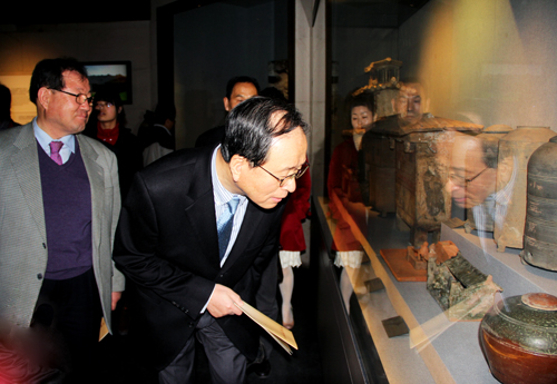 張文軍院長代表河南博物院對韓國文化交流團表示歡迎,希望在今年中韓友好交流年之后還能經(jīng)常見到他們。趙南浩先生代表韓國人民由衷歡迎張文軍等中國朋友盡早訪問韓國。62歲的許由先生表示中韓兩國一衣帶水,文化一脈相承,祝愿中韓兩國的友誼萬古長青。最后他風趣地說:爭取在66歲時訪華次數(shù)達到100次這個吉祥圓滿的數(shù)字。