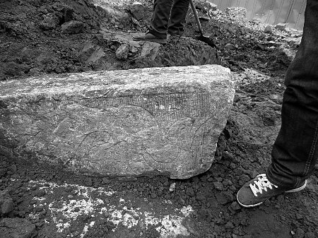 昨日上午,記者來到發(fā)現古墓的施工現場,南陽市文物考古研究所考古人員已經進駐該工地,著手發(fā)掘工作。這座古墓位于該市臥龍路與車站路交叉口南側約700米處,4塊大小不一、形狀各異的大青石散落在工地中央,其中兩塊仍半掩在泥土中,依稀能看到上面刻有圖案(如圖),現場還有不少灰色磚塊。