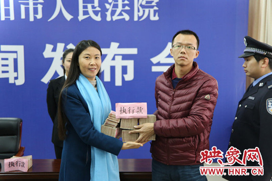 在發(fā)布會現(xiàn)場,全國人大代表、鄭州海龍集團(tuán)董事長徐曉同志為兩起典型案件當(dāng)事人家屬現(xiàn)場發(fā)放執(zhí)行款。