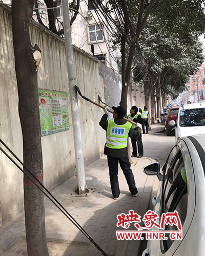 工作人員把丟在地上的廣告紙,拾起扔進(jìn)準(zhǔn)備好的垃圾袋;欄桿墻面上“頑固的小廣告”,先灑上水潤濕,然后用小鏟逐一耐心鏟掉;對路面的灰塵、生活垃圾建筑垃圾等進(jìn)行現(xiàn)場打掃,集中清運(yùn);對散亂的纜線進(jìn)行整理固定,對裸露的黃土覆蓋上防塵網(wǎng),工作場面甚是壯觀。經(jīng)過3個小時的辛苦勞動,共清理垃圾5余車。