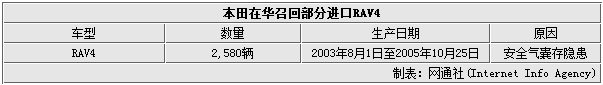 根據(jù)質(zhì)檢總局公布的消息,本次召回車型為豐田2003至2005款進(jìn)口的RAV4車型,其生產(chǎn)日期區(qū)間為2003年8月1日至2005年10月25日,共涉及2,580輛車。RAV4車型召回計劃將于2015年6月12日啟動。屆時授權(quán)經(jīng)銷商將通過電話、短信等方式通知車主實施召回。召回車輛的原因是駕駛席所用安全氣囊氣體發(fā)生器存在氣密性不良的情況,長期使用過程中可能出現(xiàn)大氣中水分進(jìn)入容器內(nèi)部,導(dǎo)致氣體發(fā)生劑吸濕后,空氣囊無法正常展開,增大駕駛員受傷的風(fēng)險,存在安全隱患。