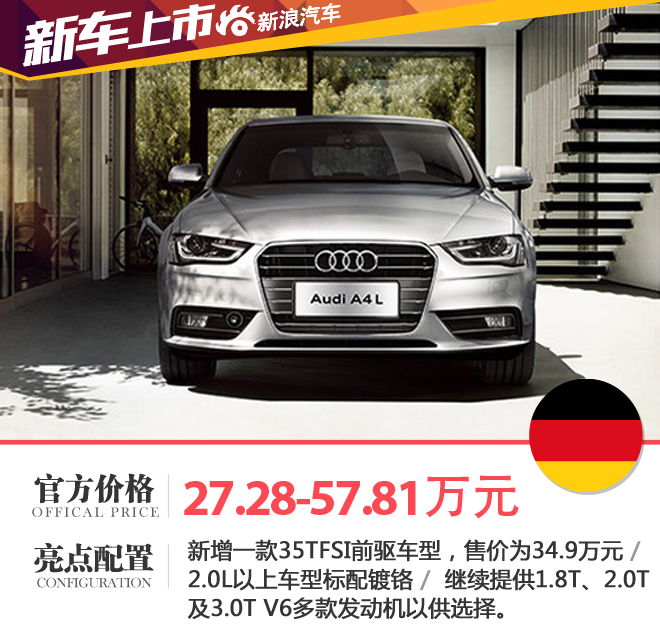 新浪汽車訊 日前,一汽-大眾奧迪官方宣布,旗下2016款A(yù)4L正式上市,新車售價(jià)區(qū)間為27.28-57.81萬(wàn)元。2016款A(yù)4L在原A4L產(chǎn)品序列基礎(chǔ)上新增一款35TFSI前驅(qū)運(yùn)動(dòng)型車型,售價(jià)為34.9萬(wàn)元。