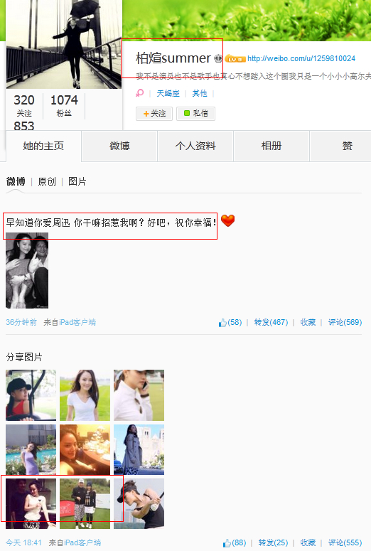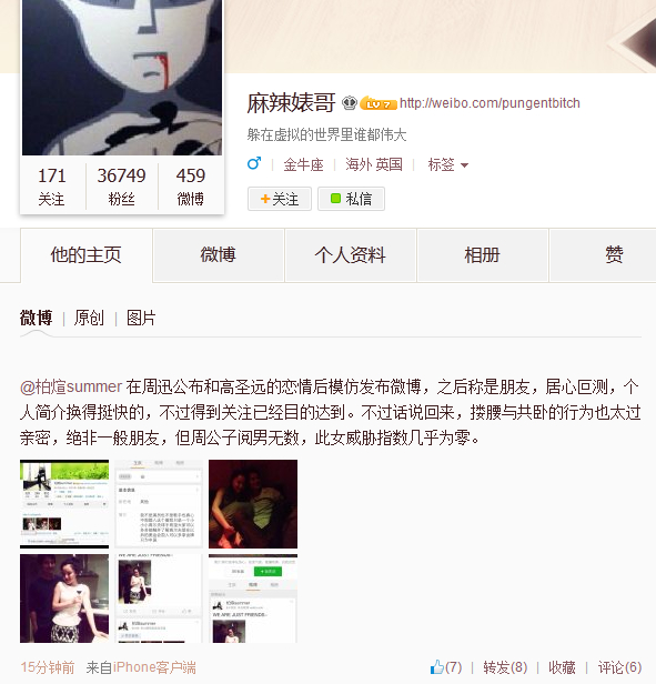 該微博也引起了不少熱心網(wǎng)友的注意,微博@麻辣婊哥懷疑@柏煊summer在刻意炒作,微博稱(chēng):“@柏煊summer 在周迅公布和高圣遠(yuǎn)的戀情后模仿發(fā)布微博,之后稱(chēng)是朋友,居心叵測(cè),個(gè)人簡(jiǎn)介換得挺快的,不過(guò)得到關(guān)注已經(jīng)目的達(dá)到。不過(guò)話(huà)說(shuō)回來(lái),摟腰與共臥的行為也太過(guò)親密,絕非一般朋友,但周公子閱男無(wú)數(shù),此女威脅指數(shù)幾乎為零。 ”