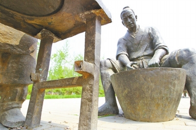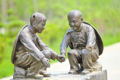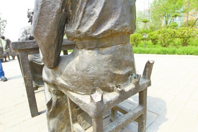 其中,第一組雕塑體現(xiàn)的是一個小男孩和一個小女孩在一塊石板上玩耍的場景,但十分刺目的是,小男孩右胳膊從腕關(guān)節(jié)上方處被鋸掉,右手不知去向,同時小女孩的兩個羊角辮也被鋸了一半;第二組是一個老年人和一個年輕人在切磋技藝的場景,但所用桌子的兩個桌牚均被鋸掉;第三組中,圍繞方桌飲酒賦詩的幾位老者所坐椅子靠背均被掰掉。