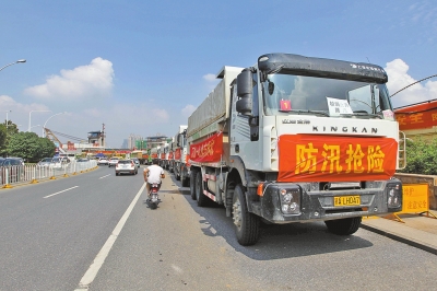 昨天,武漢市江漢區(qū)沿江大道,一排排渣土車滿載渣土,??吭诼愤?。長江北岸的堤壩上,到處張貼著“人在堤在”、“誓死保衛(wèi)大武漢”等宣傳標語。