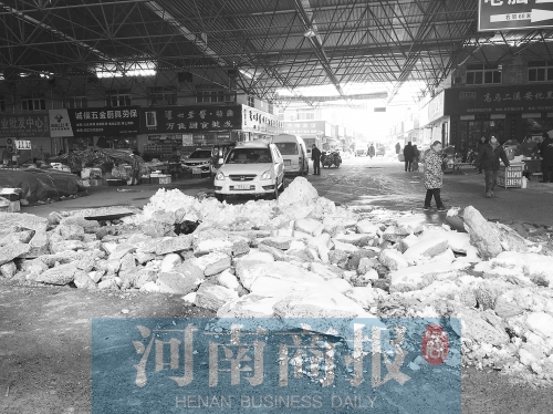 市場內(nèi),在距離大門不遠(yuǎn)處的主干道上,約30米長、8米寬的路面被挖得支離破碎,無法通行。因該交易中心與水果市場接壤,水果市場的東門尚可出入,但在兩市場的接壤處,有兩處地面也被挖掘機(jī)破壞,步行都很難通過。