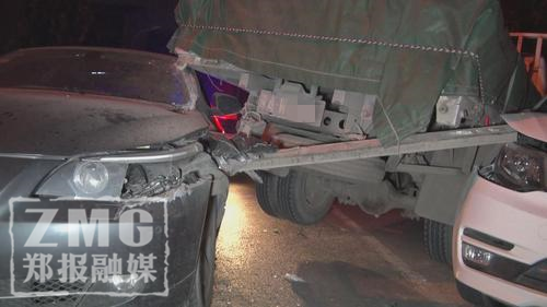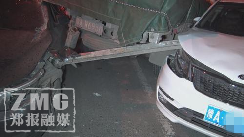 鄭報(bào)融媒記者看到,肇事寶馬車為懸掛豫A號牌的灰色5系轎車,該車車頭左側(cè)撞擊卡車后保險(xiǎn)杠后受損嚴(yán)重,受傷部位由車身延伸至駕駛艙,鐵質(zhì)車身被劃開一道約20厘米寬的口子,駕駛位上方車頂部位則卡在了卡車車尾之下。