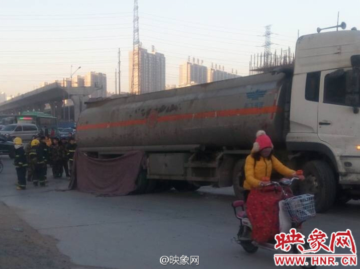 今天(1月19日)早上7點20分左右,鄭州市中州大道航海路上,一輛油罐車將一騎電瓶車男子碾倒在車下,事故現(xiàn)場被布遮擋,估計很慘。目前罐車司機(jī)已被控制住,事故還在處理中。