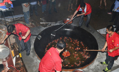 19日,在長(zhǎng)沙后湖啤酒音樂(lè)節(jié)上,4位廚師用一口直徑達(dá)3.2米的大鐵鍋,用木柴作燃料,歷時(shí)3小時(shí),成功烹飪出味道香辣鮮美的1000斤口味蝦,并免費(fèi)贈(zèng)送市民品嘗。