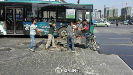 1、鄭州道路坑連坑沒人管 公交司機自力更生填坑鋪路