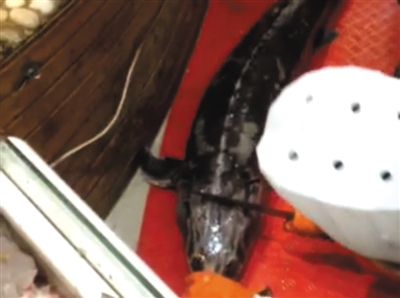 在海鮮市場(chǎng)海鮮廳另一攤位,擺放著一條約30斤的鱘鰉魚(yú)。攤位女老板告訴記者,死了的鱘鰉魚(yú)16元/斤,活的、重量在四五十斤的鱘鰉魚(yú)售價(jià)22元/斤。
