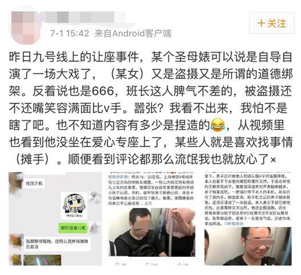 1. 我當(dāng)時(shí)就在這節(jié)車廂里,大媽自始至終都是在好好跟他商量,讓座給另一個(gè)抱娃的,這小伙子根本沒有讓出來的意思。這也罷了,畢竟正如他后來自己所說,沒有法律規(guī)定必須讓座。但后來他反而拿手機(jī)拍大媽,周圍好幾個(gè)乘客看不下去也拿手機(jī)反拍他。一開始他還很得瑟對鏡頭做勝利的手勢,后來突然搶了對面妹子的手機(jī),還抓傷了對方。被幾個(gè)男士按倒之后說了一串外語,其中聽到了罵人的話。