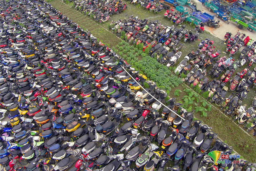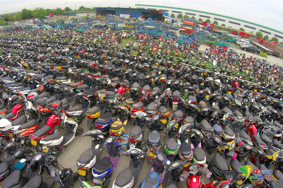 2015年6月4日,超寬、超速、非法營運三輪電摩及各種摩托車密密麻麻重重疊疊地堆積在一起,從高空中俯瞰場面震撼。這不只是杭州一家報廢車停車場的情景,幾乎每家停車場都如此。工作人員說,這都是交警執(zhí)法過程中收繳的。工作人員跟記者抱怨說,電摩停放時間太長,再不拆解都停不下了!據(jù)負責人介紹,杭州自禁摩托車以來,總有一些違規(guī)者偷偷地利用摩托車充當黑摩的。此舉既不安全,也暗藏各種不安全因素。2014年,杭州有204人死于涉及電瓶車的交通事故;在所有交通事故中,涉及電瓶車的占到四成以上。3月25日,有杭州媒體報道,杭州收繳的電動車已堆滿停車場,據(jù)估算馬路上還有百萬輛以上超標車。(金童子/攝)