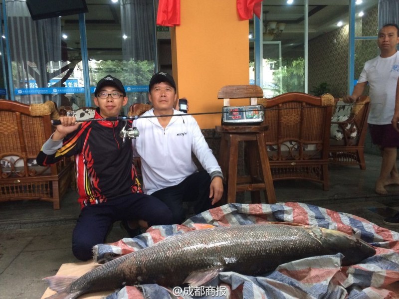 昨日下午,在成都商報(bào)記者的見證下,劉氏父子為這條大魚量了身高、稱了體重:身長1.63米,重98.4斤。