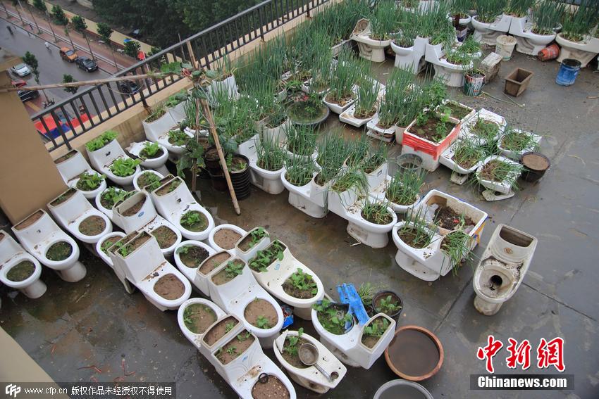 2015年07月16日,山東省菏澤市,在中央公館小區(qū)21號(hào)樓樓頂?shù)南榔脚_(tái)上,有業(yè)主擺放了數(shù)十個(gè)廢棄馬桶,種上了各種蔬菜。還用廢舊沙發(fā)搭起了鴨棚,養(yǎng)起了鴨子。在樓頂?shù)慕锹淅?,記者還發(fā)現(xiàn)了一個(gè)簡(jiǎn)易廁所。該樓居民表示,“菜園”的主人平時(shí)就直接使用廁所糞便作為蔬菜的肥料。天氣炎熱時(shí),氣味很大,附近居民苦不堪言。