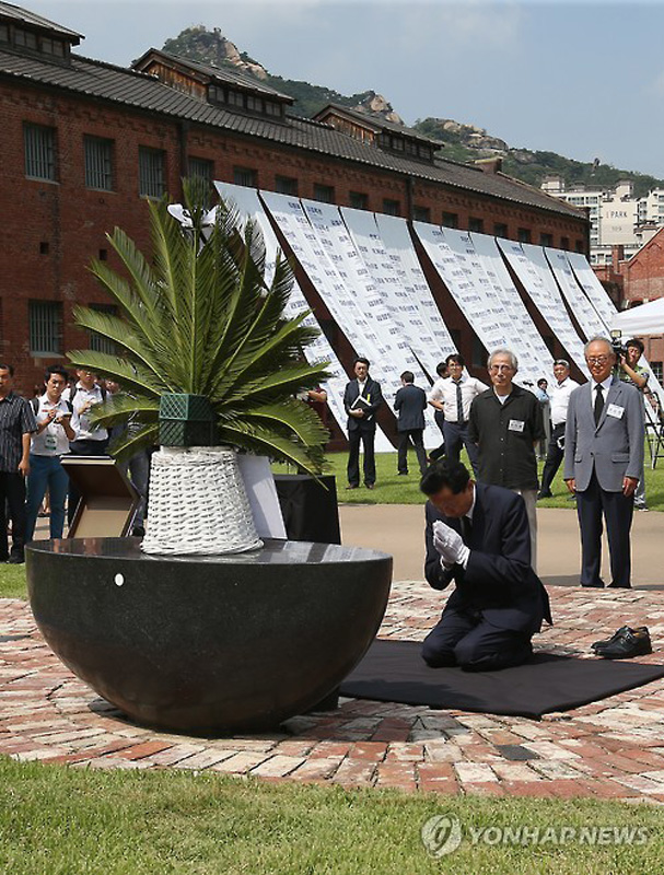 當(dāng)?shù)貢r(shí)間2015年8月12日,正在韓國(guó)訪問(wèn)的日本前首相鳩山由紀(jì)夫參觀了首爾“西大門刑務(wù)所”博物館,并在追悼碑前跪地禱告。據(jù)悉,西大門刑務(wù)所始建于1908年,用于關(guān)押反抗日本殖民統(tǒng)治的韓國(guó)抗日義士。鳩山由紀(jì)夫表示,日本理應(yīng)承認(rèn)殖民侵略歷史。(圖片來(lái)源:網(wǎng)絡(luò))