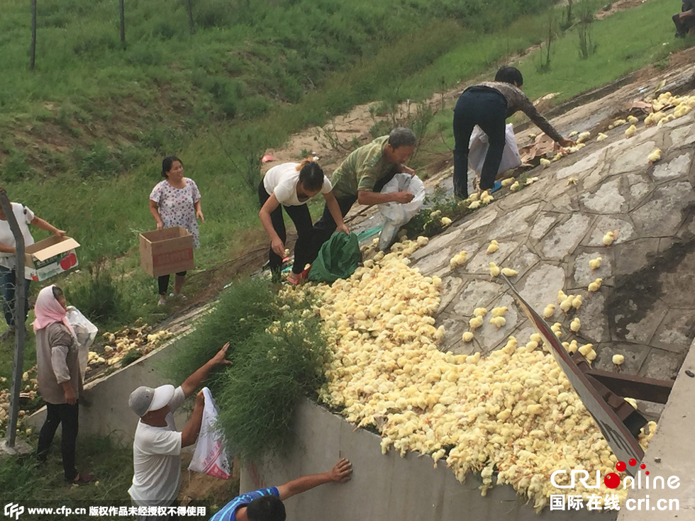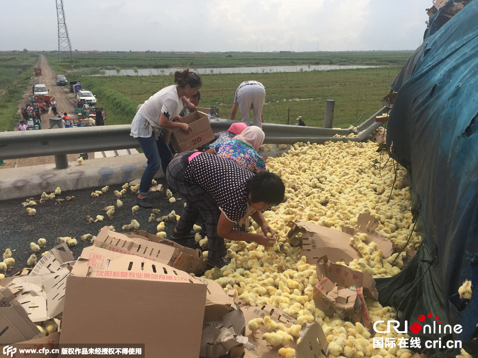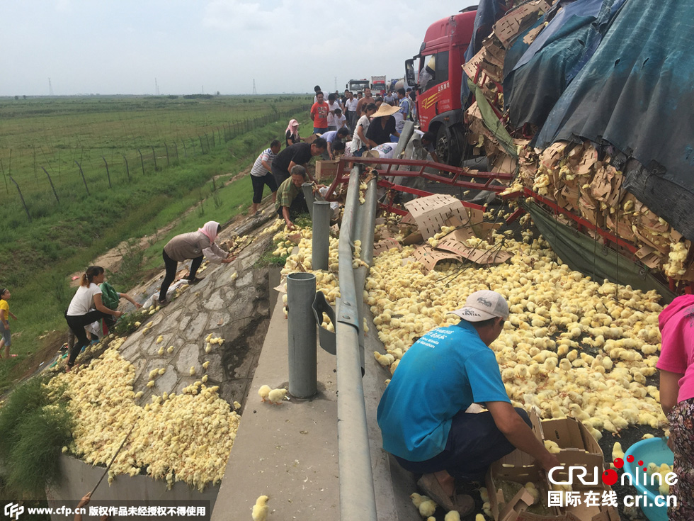 8月25日中午,山東榮烏高速濱州沾化區(qū)段,一輛山東禽類運輸車輛傾翻,車上裝有數(shù)萬只小雞。無數(shù)小雞散落在路上和高速護(hù)坡上,死的死傷的傷,大多數(shù)存活。