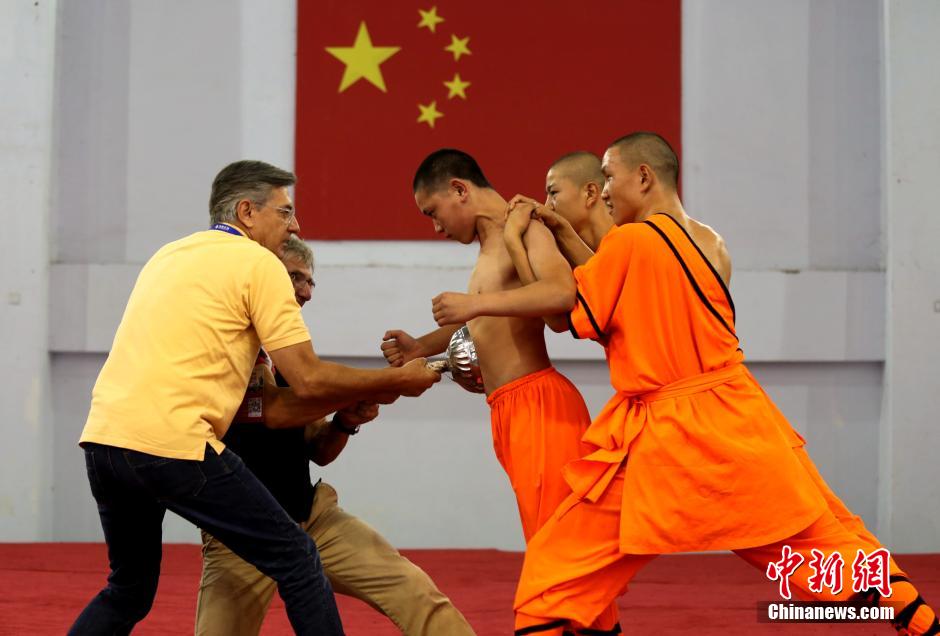 9月20日,河南登封,前來參加2015鄭州航展的國際特技飛行員,在登封一所武校內(nèi)用力想拔掉吸在少林弟子肚子上的飯碗,但拼盡全力,也未能成功。 中新社發(fā) 王中舉 攝