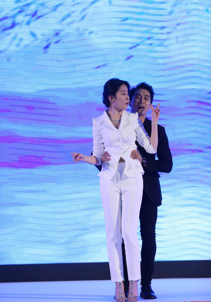 在宋承憲的提議下,兩人現(xiàn)場(chǎng)模仿起電影《泰坦尼克號(hào)》的經(jīng)典造型,可是當(dāng)宋承憲走上前環(huán)抱面朝觀眾的劉亦菲時(shí),主持人提議兩人“飛一下”,劉亦菲突然害羞地躲了起來(lái),“最近太重了,得減減肥?!彼纬袘棄膲牡匾恍?,接話道:“謝謝劉亦菲。我也是快抱起來(lái)的那一剎那心想‘糟了,可能飛不起來(lái)’?!迸罴杀蝗苏f(shuō)胖,男友竟然當(dāng)眾吐槽,劉亦菲這時(shí)顧不得避忌,做狀要打?qū)Ψ?,甜爆整?chǎng)的畫面都被攝影機(jī)記錄下來(lái)了。