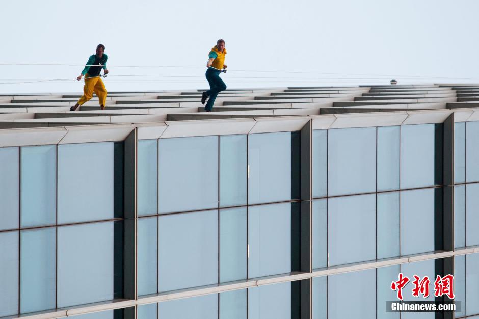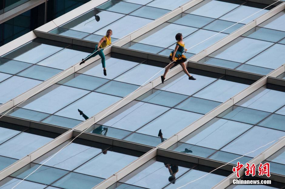 10月15日,美國BANDALOOP高空舞蹈團“空中芭蕾”中國內地首秀空降上海街頭,4名高空舞者在80米高的玻璃幕墻上翩翩起舞,舞蹈之美和力量之美在云端融合。中新社記者 張亨偉 攝
