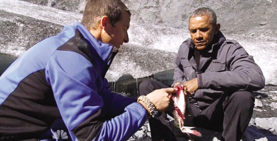 奧巴馬和英國野外生存專家貝爾·格里爾斯在《荒野求生》節(jié)目里,這是美國在任總統(tǒng)第一次上真人秀節(jié)目。