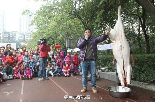 12月24日下午,重慶玉帶山小學(xué)舉行“民俗文化代代傳 傳統(tǒng)文化進(jìn)校園”活動。學(xué)校從鄉(xiāng)下買回兩頭年豬,請來村民講述年豬習(xí)俗,殺豬匠殺豬后,科學(xué)老師為學(xué)生講解年豬身體結(jié)構(gòu)。