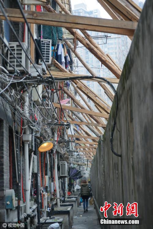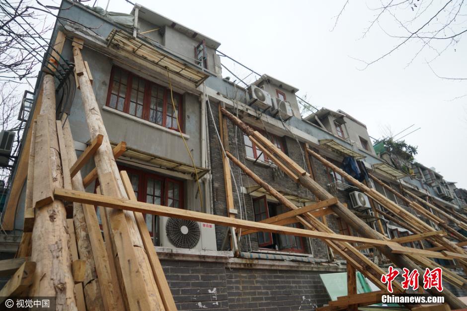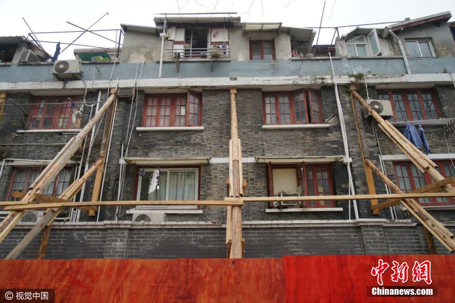 3月13日,上海黃浦區(qū),黃陂南路永年路一石庫門舊里房屋發(fā)生傾斜開裂,外墻用數十根木棒進行加固,場面十分壯觀,不少路人走過時都加快了腳步。據了解,此處房屋開裂傾斜是由于相隔一條馬路的兩個建筑工地野蠻施工造成。此段居民小區(qū)為上世紀20年代建成的磚木結構石庫門建筑,房齡至今已經90余年,受影響的居民就多達幾十戶。 圖片來源:視覺中國