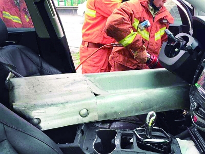 一輛越野車撞上互通分流處的護(hù)欄鋼板,猛烈的撞擊使一根護(hù)欄鋼板戳穿車頭,插在駕駛室里的女司機(jī)王某的左大腿及腹部,令其無法動(dòng)彈,王某忍痛撥打電話報(bào)警求救。