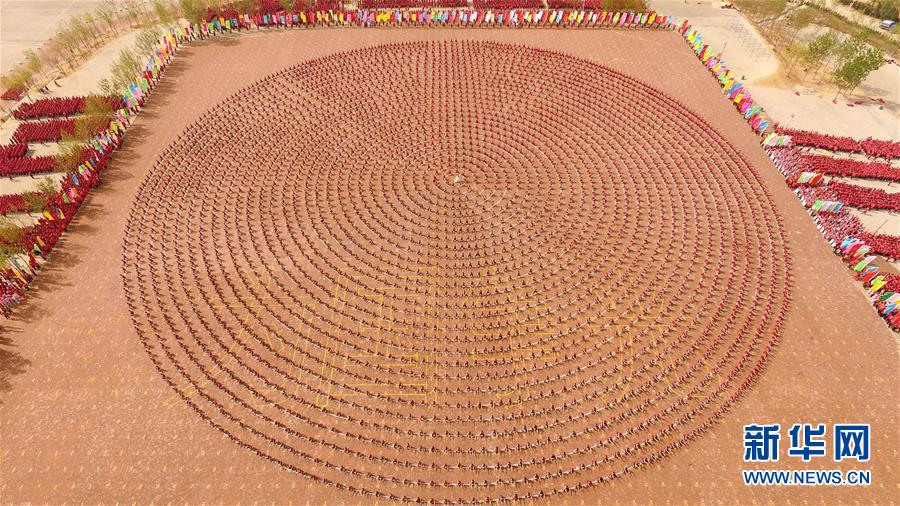 4月7日,在河南登封少林塔溝武術(shù)學(xué)校練功場,上課間操的學(xué)員擺出圓形圖案。當(dāng)日,河南登封少林塔溝武術(shù)學(xué)校2016年“春訓(xùn)”拉開帷幕,2.6萬名學(xué)員同上陣,進(jìn)行隊形變換、十八般兵器、少林硬氣功、少林集體棍等多種功法演練?!按河?xùn)”是少林塔溝武術(shù)學(xué)校每年春季開展的一項強(qiáng)化訓(xùn)練活動,旨在提升學(xué)員的耐力和競技狀態(tài)。新華社發(fā)(牛書培 攝)