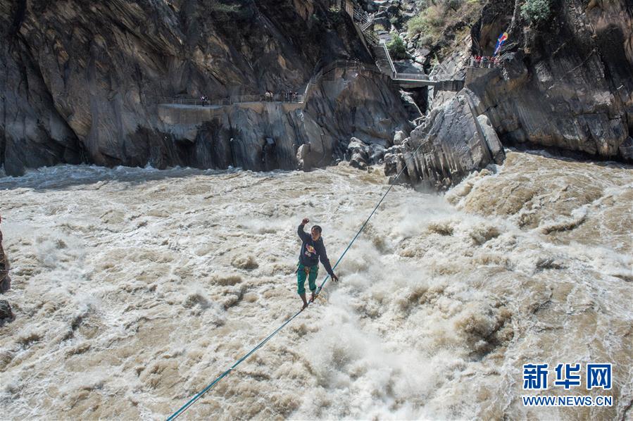 4月26日,張亮在扁帶上行走。當(dāng)日,在云南香格里拉的長江天險(xiǎn)虎跳峽上,“中國扁帶第一人”張亮利用寬度只有2.5厘米的扁帶,在距離江面16米的高度上成功行走60米,耗時(shí)5分58秒抵達(dá)虎跳峽香格里拉一側(cè)的終點(diǎn)完成挑戰(zhàn)。