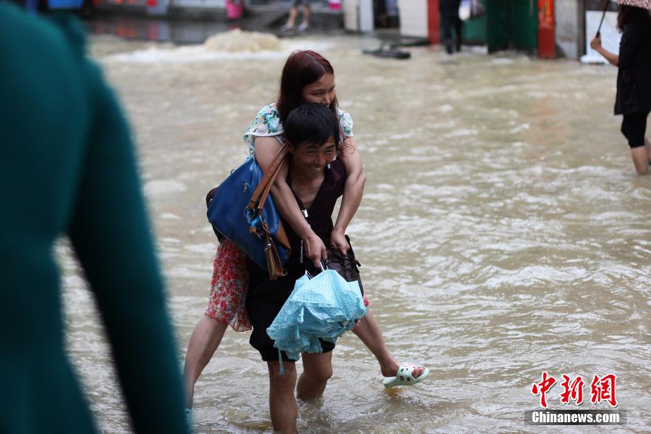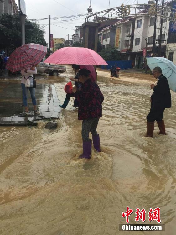 5月5日,地處湘南的永州市道縣遭遇暴風雨襲擊,縣城內多處低洼路段被水淹沒。當地防汛部門正嚴密監(jiān)控雨情、水情,確保安全度汛。圖為市民趟水出行。 中新社發(fā) 何紅福 攝