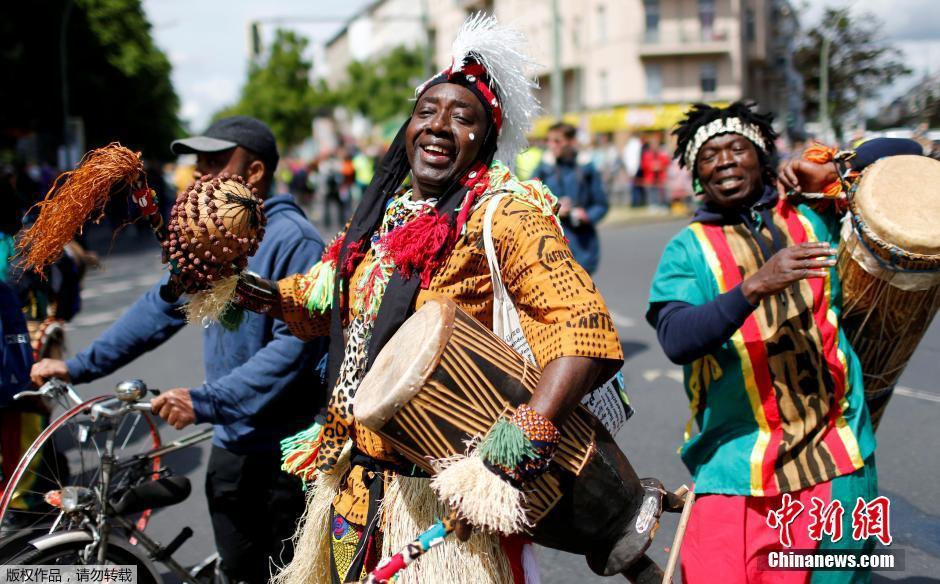 當(dāng)?shù)貢r(shí)間5月15日,德國(guó)柏林,當(dāng)?shù)孛癖娚碇厣椩诎亓治幕駳g節(jié)上參加游行。當(dāng)日,柏林舉辦文化狂歡節(jié)大游行,數(shù)千名來自世界各地的狂歡者加入。