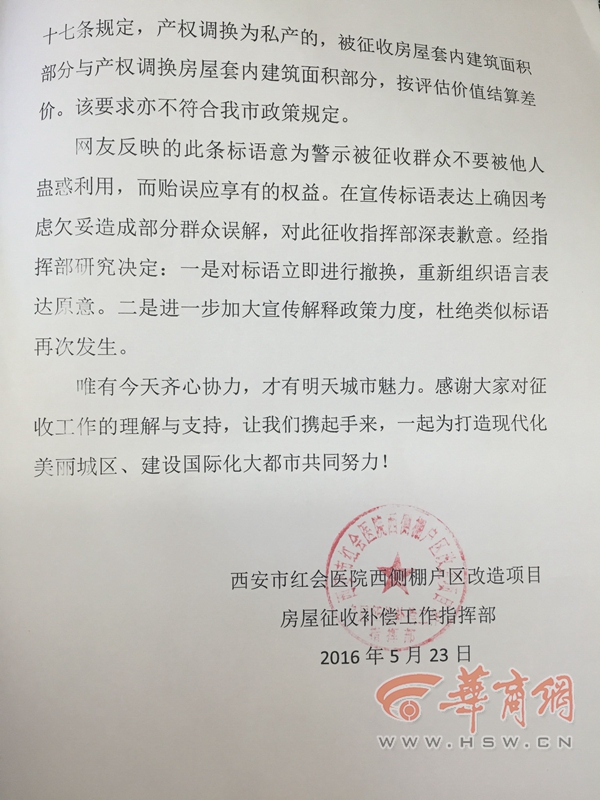 對(duì)于標(biāo)語(yǔ)上的用詞是否恰當(dāng)?劉組長(zhǎng)表示,確實(shí)考慮欠妥造成部分群眾誤解,征收指揮部深表歉意。5月23日下午,已將標(biāo)語(yǔ)進(jìn)行撤換,并重新制作新的標(biāo)語(yǔ)懸掛。