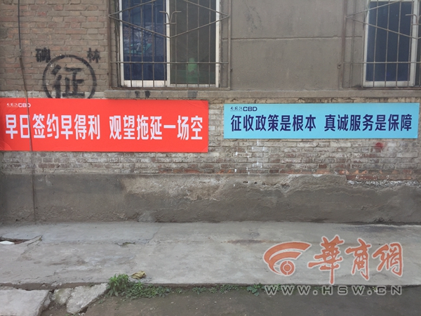 居民樓墻體上貼著拆遷的標(biāo)語(yǔ)