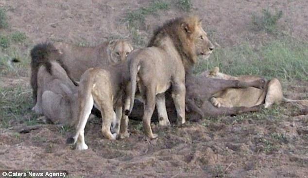 獅子們眼見水牛無路可逃,爭相跳起來搶奪食物。水牛掙扎的叫聲逐漸變小,看起來接受了自己的命運。