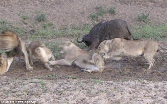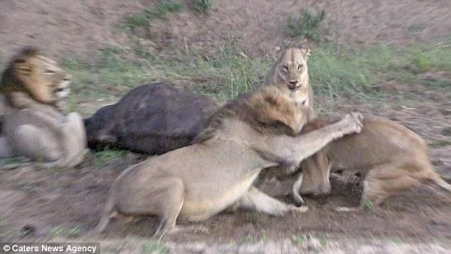 這次攻擊造成了一發(fā)不可收拾的局面,兩群獅子開始互毆決定誰先吃掉可憐的水牛。