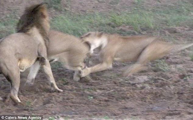 突然,兩群獅子開始內訌,一只母獅子攻擊了一只不屬于自己群體的公獅子,試圖阻止它享用水牛。
