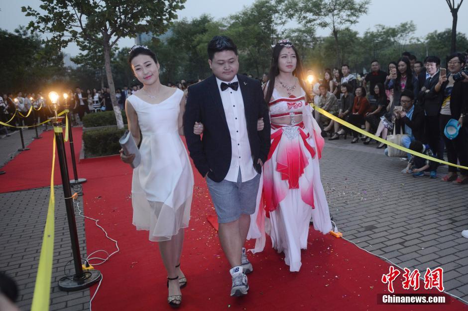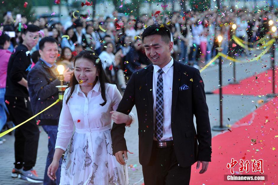 6月3日晚,山西大學美術(shù)學院畢業(yè)典禮,大學畢業(yè)生通過紅地毯走進會場,學弟學妹們夾道歡迎。當畢業(yè)生情侶一起走秀時,引起學弟學妹們一陣尖叫。韋亮 攝