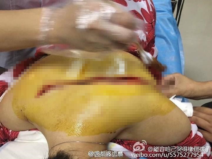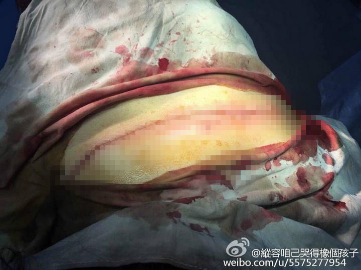 在醫(yī)院治療時(shí),有人幫她拍下一組照片。其中一張,該年輕女子趴在手術(shù)臺(tái),可明顯看到其后頸下方15厘米處,有一條從左手腋窩延生至右肩的傷口,醫(yī)生正對(duì)其進(jìn)行手術(shù)。而另一張圖片,是其傷口縫合后情況,背部有一條如蜈蚣般的傷痕,令人觸目驚心。